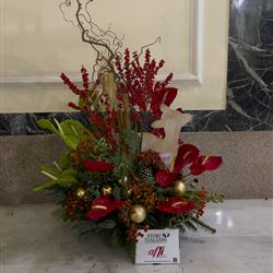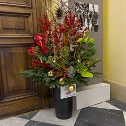 Per questa decorazione abbiamo scelto elementi che evocano il Natale e il nostro territorio: Ilex, Anthurium, bacche di rosa, abete, agrifoglio, nocciolo, spighe di grano e pigne, sapientemente intrecciati per creare un insieme armonioso, autentico e profondamente legato alla tradizione.